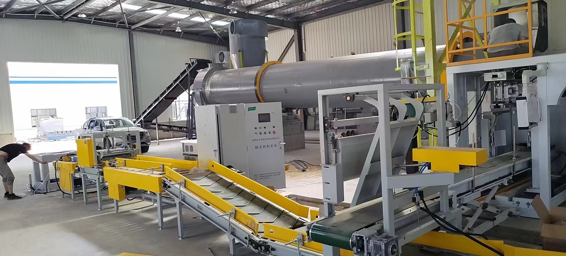 觸摸屏琴式控制系統、獨特的給料系統、靜態(tài)配料秤、間歇式混合機,灌裝水溶肥,粉料的水溶肥包裝機,折邊機,縫包機。